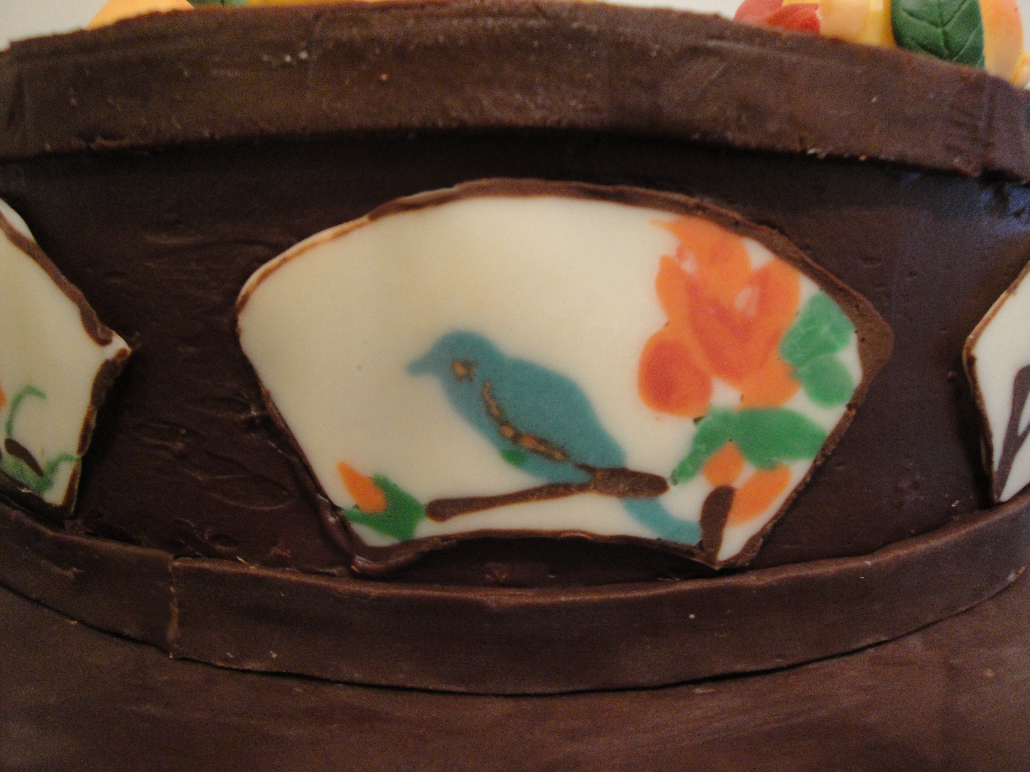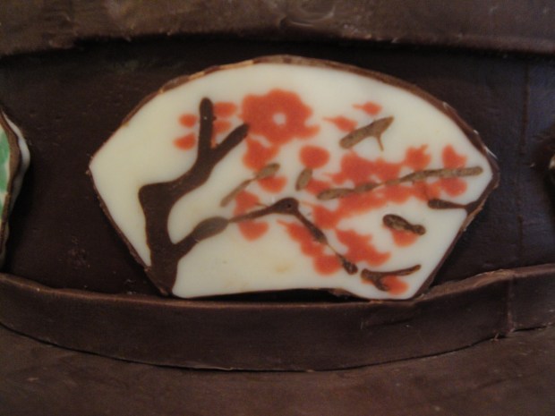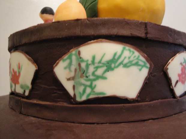Chinese trays and furniture were often decorated with ceramic pieces painted with colorful pictures. For the cake platform, 8 different fan shape ceramic like chocolate pieces, each individually piped by hand adorn the side of the cake.