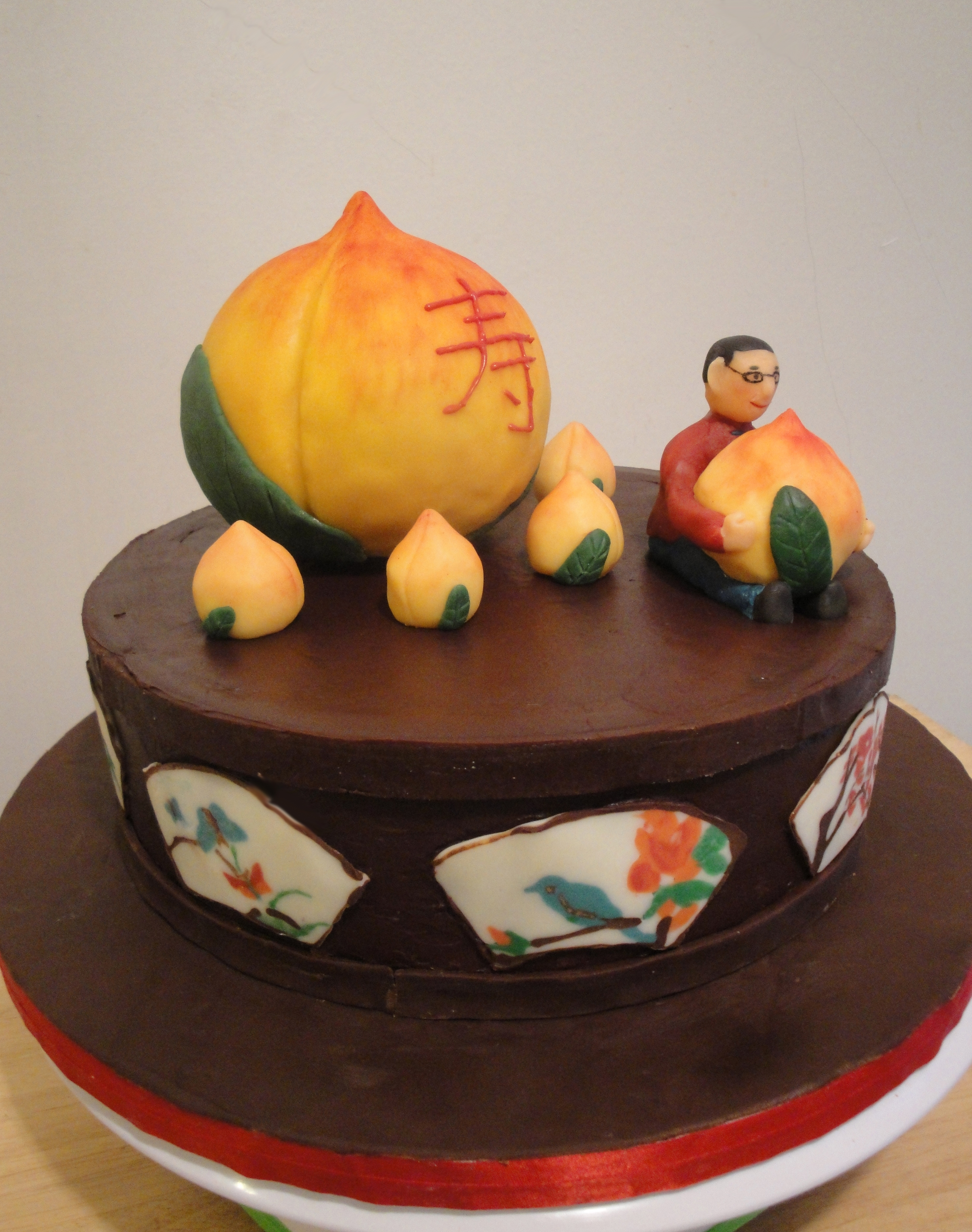 Mr. Lin was about to turn 80 by the Chinese Lunar count which calls for a great celebration! His son and daughter-in-law contacted me to make him a Longevity Peach cake for this special occasion. They wanted a light cake and not too sweet. The original idea was to make a 3-D Longevity Peach cake. But a light cake most likely will be difficult to hold up the 3-D structure. Fondant would be the perfect material for the cover of a 3-D cake, but it will be too sweet. So this was my plan: large 3-D Longevity Peach topper with a cartoon like Mr. Lin sitting on top of the cake with another peach in his lap; a Boston Cream Pie is light and not so sweet, providing the perfect chocolate background mimicking wood color of an Asian type platform or tray which would be decorated with Asian paintings.