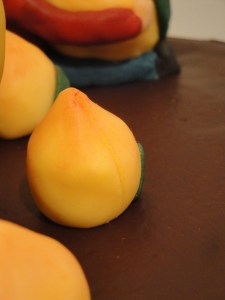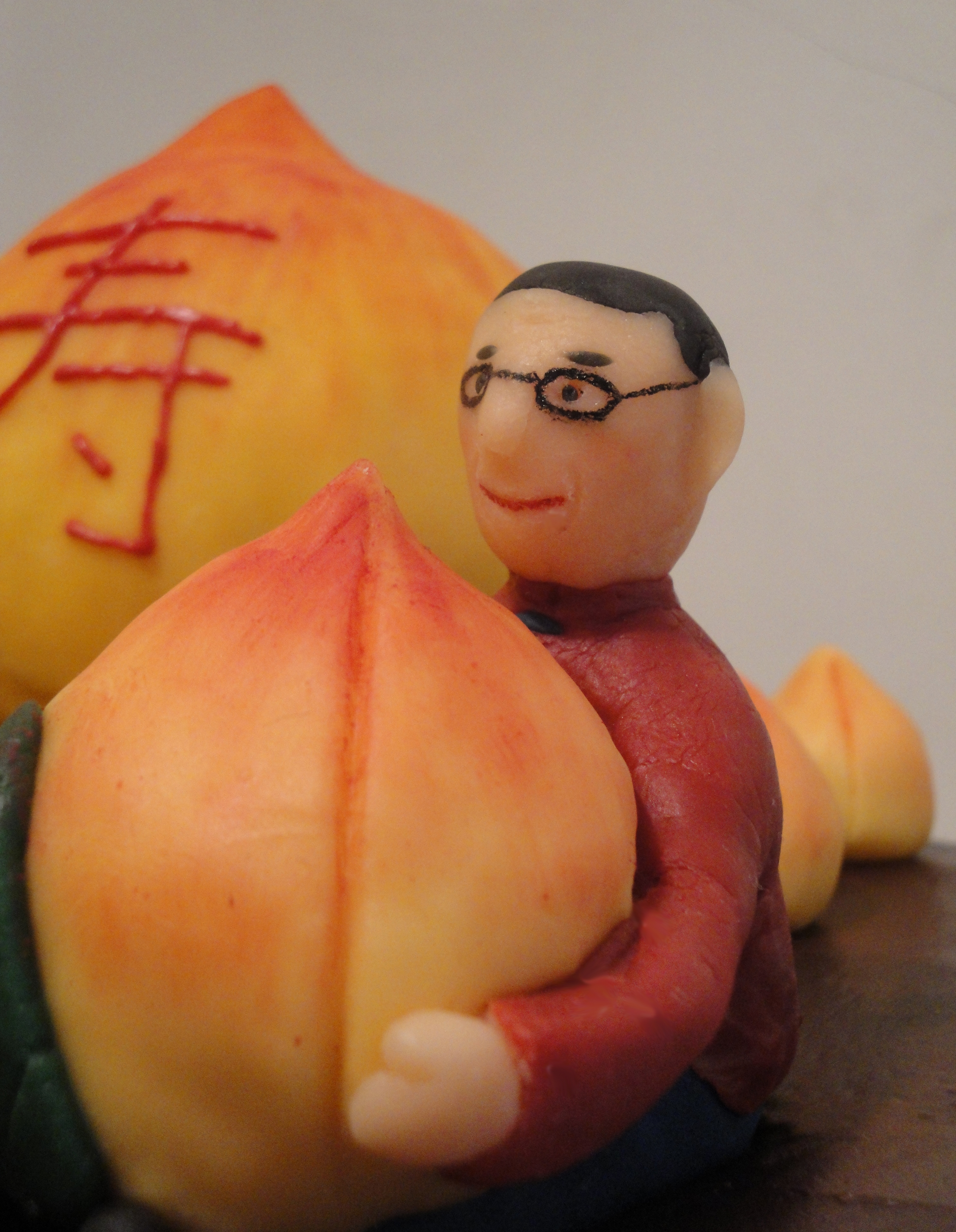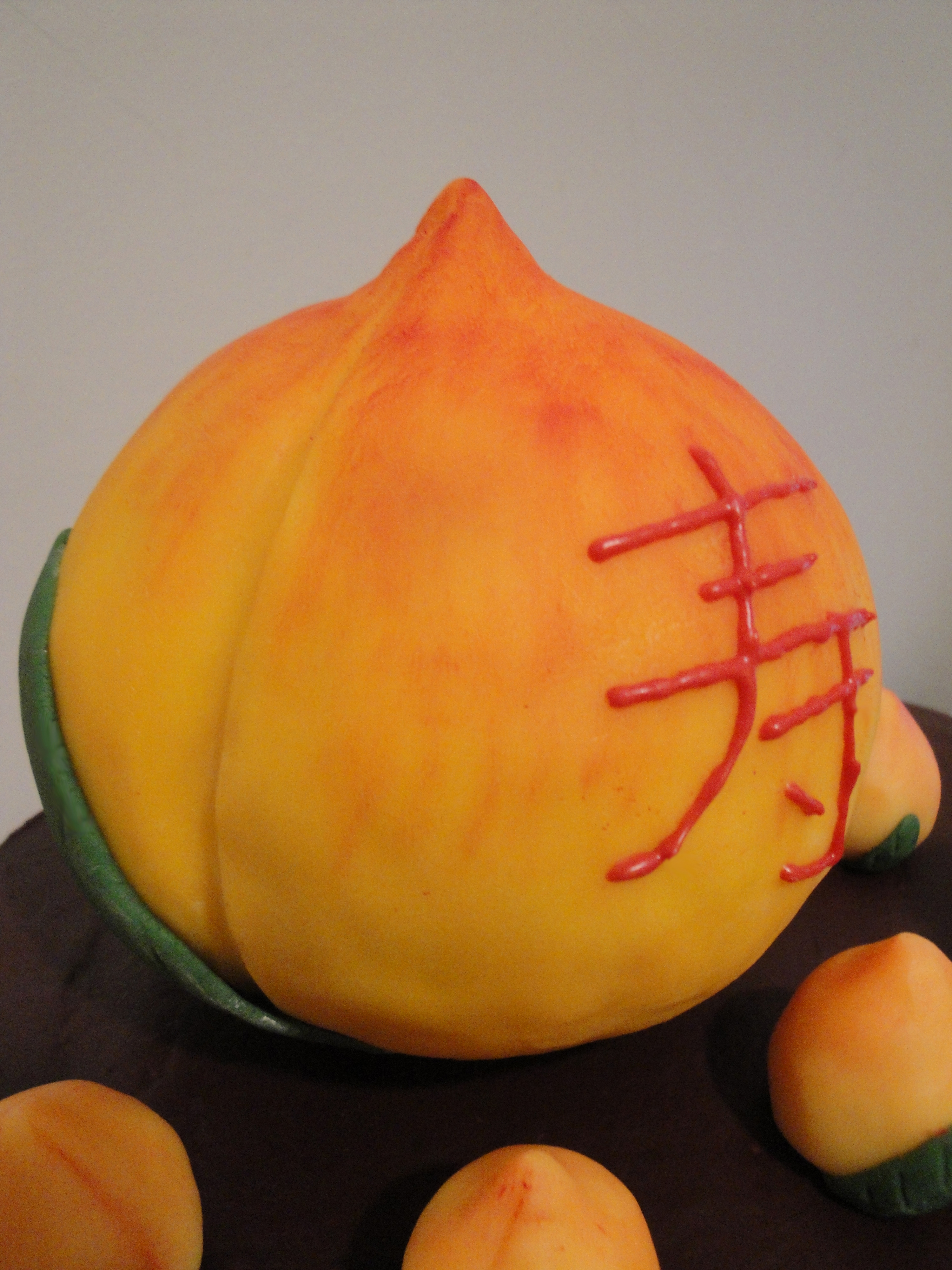 The large Longevity Peach was made with rice kripsy covered with modeling chocolate and was fully edible. The character and smaller peaches were made with all modeling chocolate.