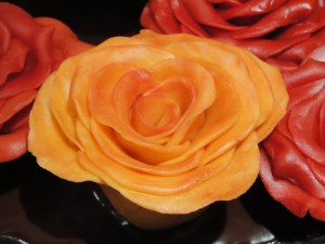 The orange roses were dusted with red color to add dimension and realism to the petals.