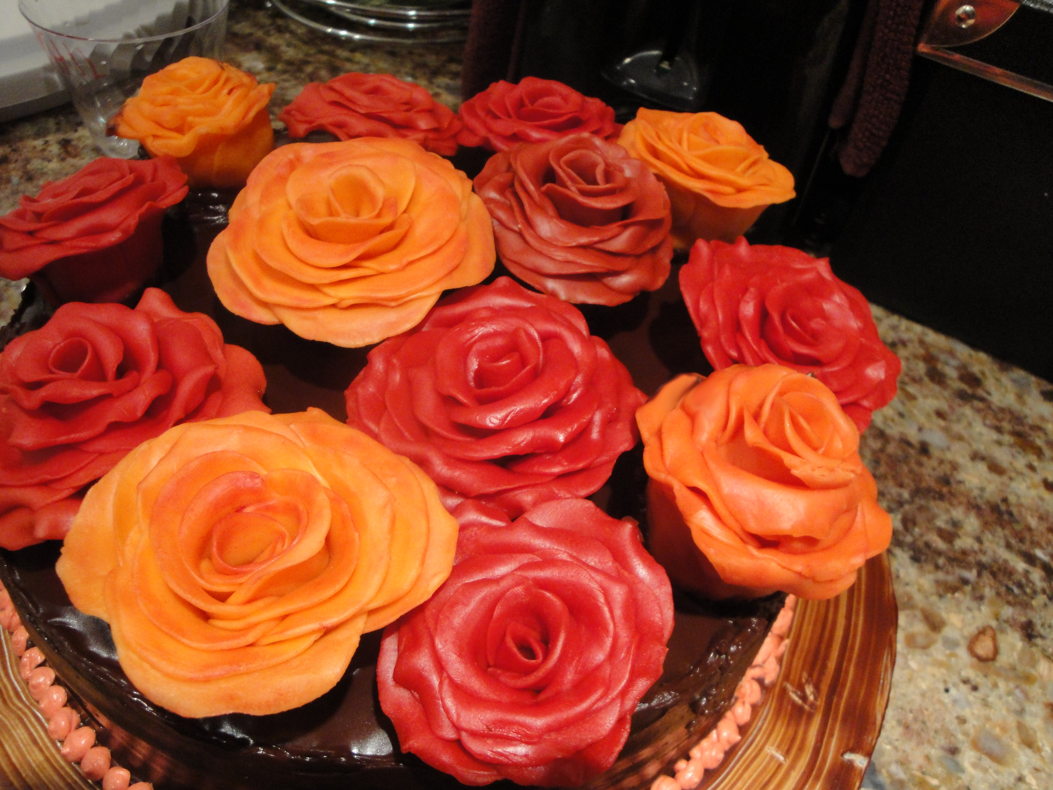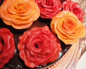Ireen loves chocolate, flowers and bright colors. For her birthday cake, these three things combined was a wonderful inspiration for a great cake. I envisioned a bouquet of bright orange, red and burgundy roses with a glossy chocolate covered cake as the perfect backdrop. Each rose was made by hand petal by petal with modeling chocolate and constructed and sculpted to make the rose look realistic. These flowers simply look too gorgeous to be eaten and the cake too beautiful to be cut.
