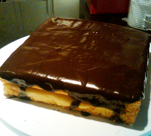 The vanilla sponge cake was soft and spongy with a thick layer of vanilla pastry cream in between. The chocolate ganache was a great balance to the vanilla flavored cake and cream. I look forward to making this Boston Cream Pie again for another occasion.