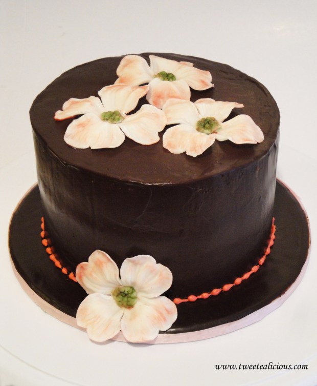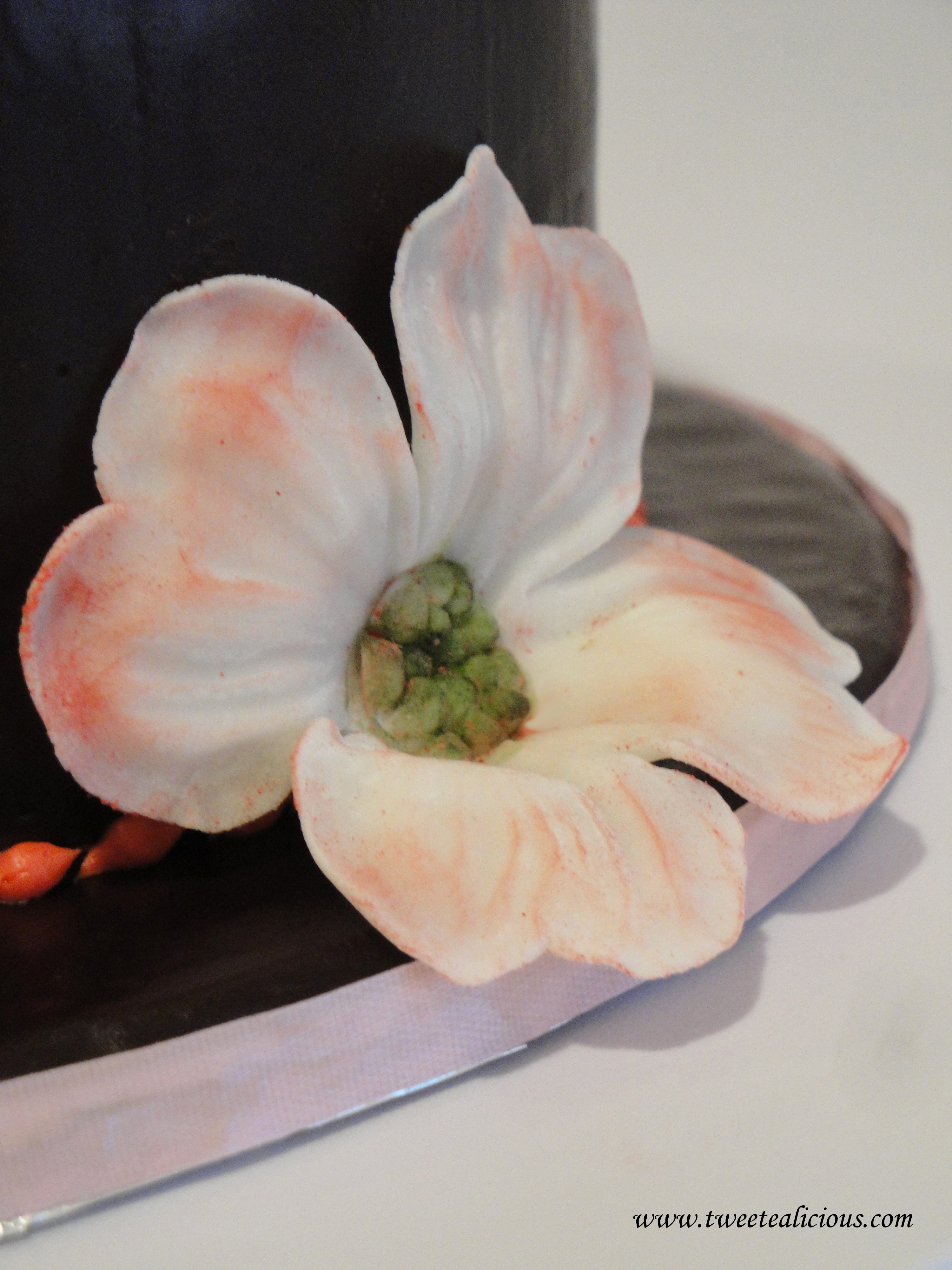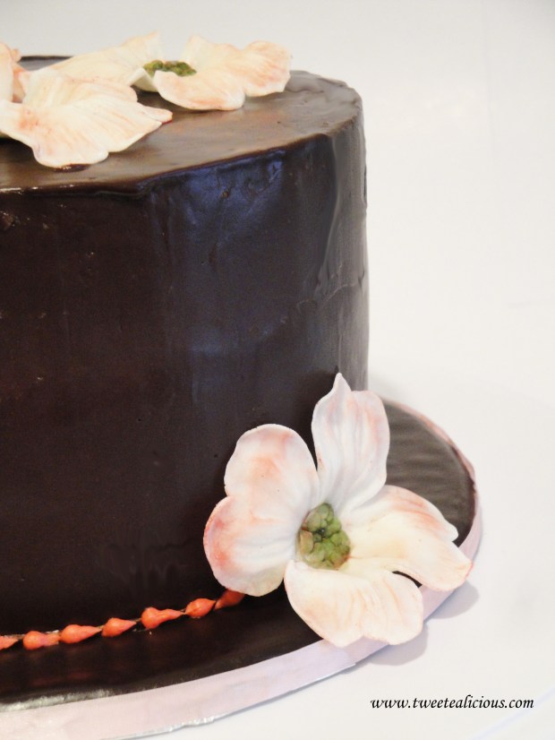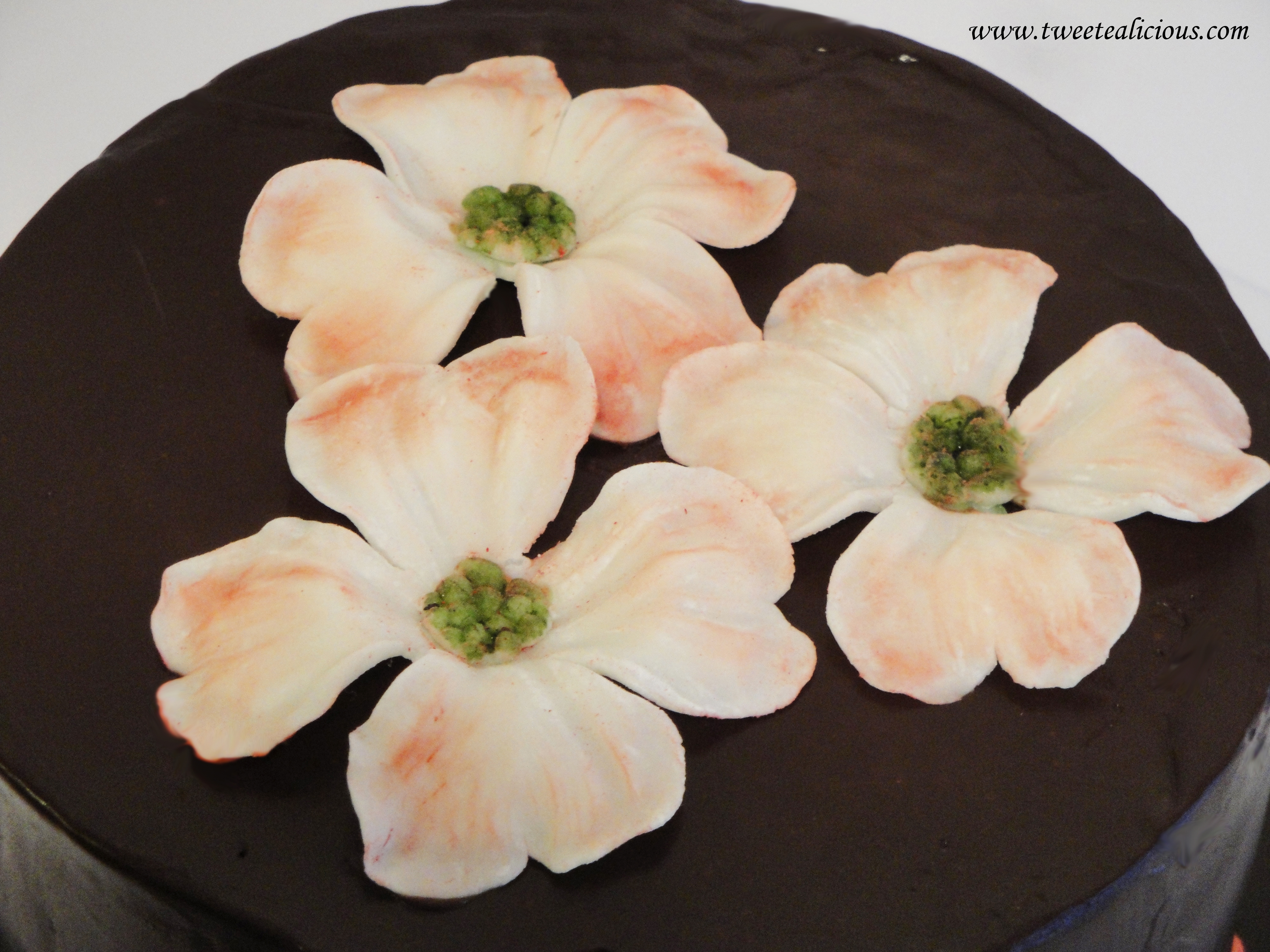 The best part about this birthday afternoon tea was the reaction of the birthday girl when she saw the cake. She was so excited that she was jumping up and down while clapping her hands. I think we all got a kick out of it. This cake was highly experimental, using all Asian flavors. Being a fan of green tea and red bean, I decided to combine the two flavors. The cake was a green tea sponge cake. For the filling, I layered green tea pastry cream on top of red bean paste. For the outside coating, I made a green tea white chocolate ganache. Then topping the cake with a few pink dogwood flowers along with a bow on the side, the pink and green color combination was just beautiful.