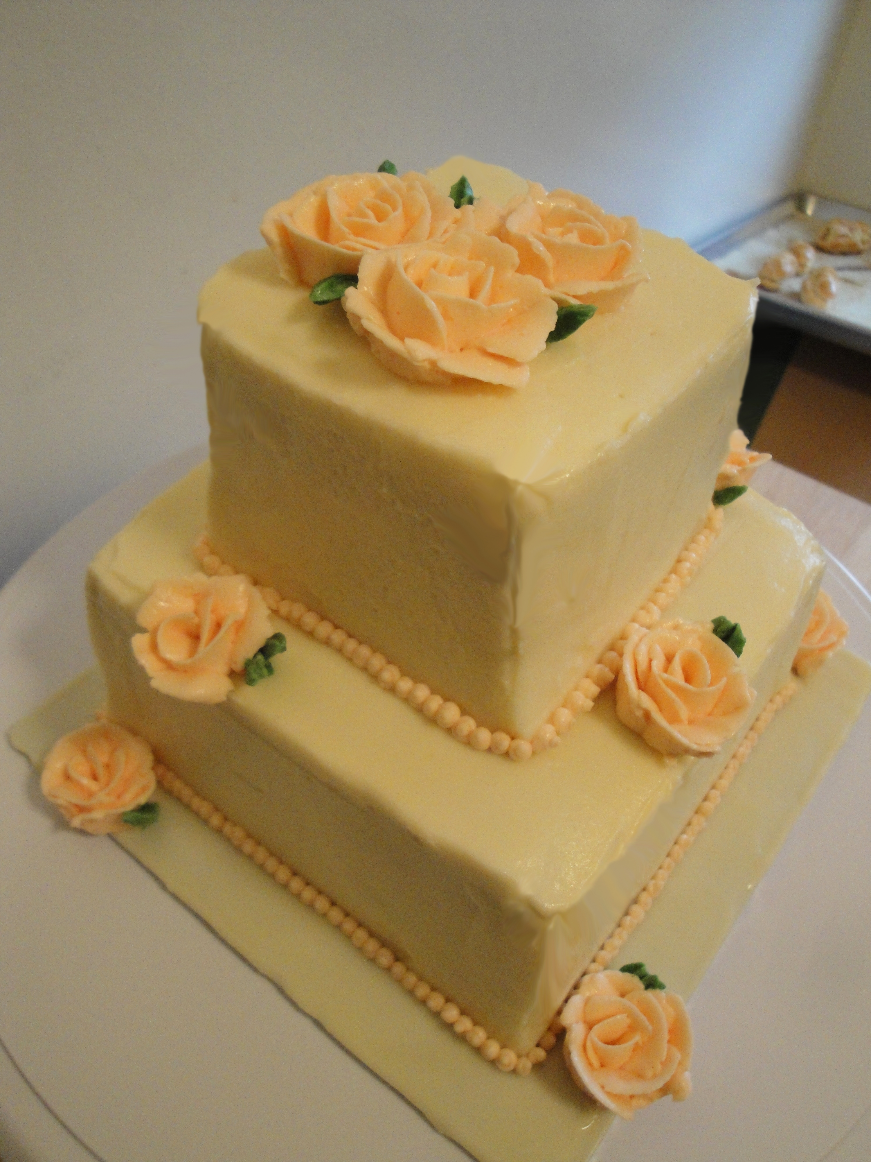 We have not been able to catch up with the Wilsons for quite a while already. So we invited them over for Afternoon Tea, which is one of my favorite things. They left the decision of the cake to me which made it very difficult as there are so many good cakes that can be made. Instead of struggling further, I decided to make my chocolate velvet cake again, but with a twist. I decided to kick up a notch on the decoration. So here is what I came up with: a double tier chocolate velvet cake covered with cream cheese frosting, decked with cascading peach color roses.